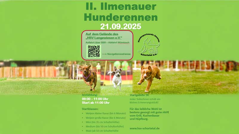 Am Sonntag, den 21. September 2025, findet auf dem Gelände des HSV Langewiesen e.V. das II. Ilmenauer Hunderennen statt. Die Veranstaltung wird vom Hundesportverein Ilmenau/Schortetal e.V. organisiert und verspricht einen spannenden Tag für Hundebesitzer und Zuschauer.